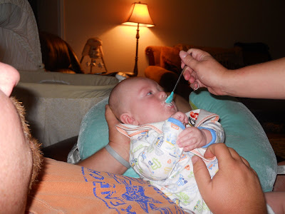 Tonight we cheated a little and let Rhett have some cereal. We go to his 4 month check up on Tuesday & should get to start on cereal and baby food. So Jarrod & I went out tonight and bought a box of cereal and all the 1st foods. When we got home we just had to try a little. He spit it out at first but after a while he got the hang of things. It was quit hilarious to watch. We can't wait to see all of his silly faces & to see what he will & will not like.